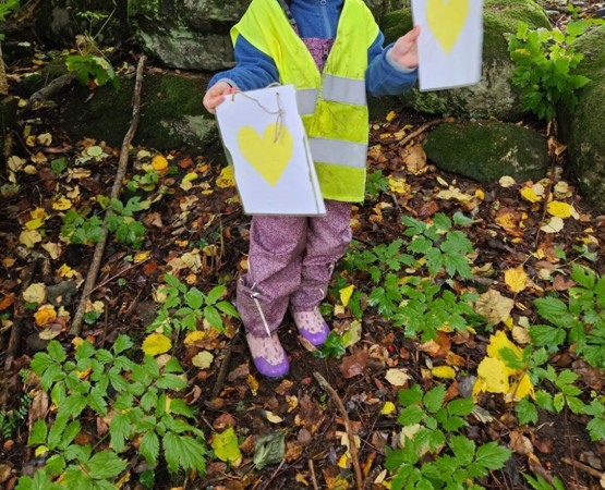 I fin gangavstand til barnehagen ligger Nøtteskogen - en eventyrskog med sildrende bekker, nøtter, trær og bålplass. Formjakt er en populær aktivitet vi gjerne tar med. I Nøtteskogen fant vi også mange fine høstblad man kan lage kunst med.