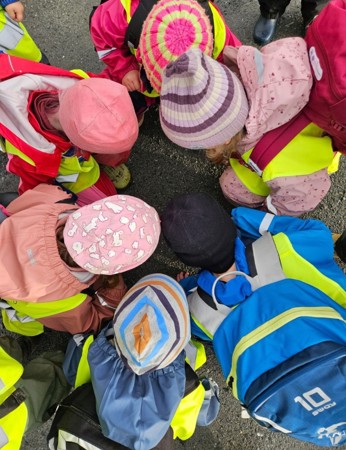 "Sjå! To meitemarka!" På tur kan barna få nye impulser, og oppleve fellesskap på en annen måte. Her finner vi naturlige lekematerialer og oppdager nye ting. Vi er opptatt av å stanse opp og utforske det vi ser på veien.