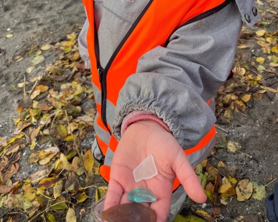 Barna fant mange fine skatter i fjæra ved Kystens Arv. Og på vei tilbake til barnehagen er det fint å være liten og få en hjelpende hånd fra en som er større.