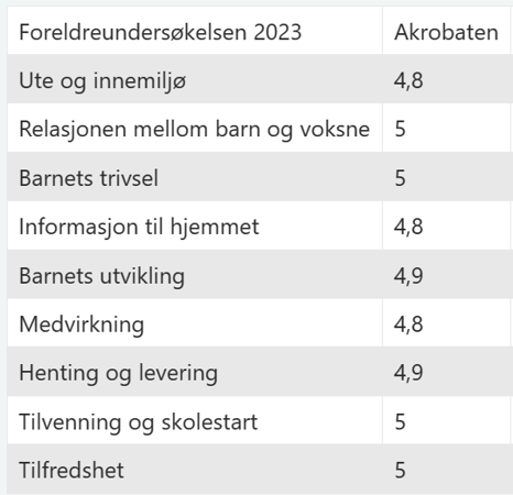 At foreldre gir oss høyeste score på hvor tilfredse de er med barnehagetilbudet betyr mye for oss. Vi tar med oss alle tilbakemeldingene videre, både hva vi kan bli bedre på, og hvorfor foreldre er så fornøyde. Et godt foreldresamarbeid er viktig for oss. Både i den daglige dialogen, på foreldresamtaler og foreldremøter.