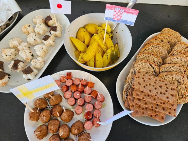 Til lunsj ble det fingermat fra verden! Middelhavspoteter fra Kroatia, Onigiri fra Japan, köttbullar fra Sverige og bratwürst fra Tyskland. I Stadsbygd bor det mennesker fra mange ulike kulturer - en viktig del av vår identitet, og vi er heldige som har flere land representert i barnehagen vår. Spennende smaker og deltakende og nysgjerrige barn under matlaginga.