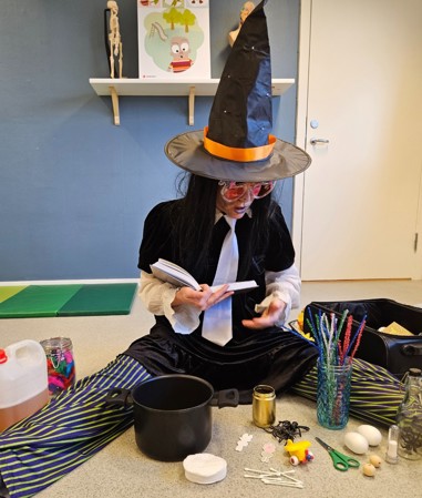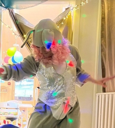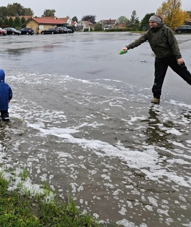 Ansatte som tilrettelegger for litt ekstra morsom lek når det regner.